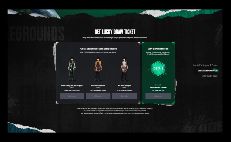 Head over to the official PUBG x Stellar Blade Web Event page and log in with your KRAFTON ID. From there, you can earn Lucky Draw tickets in two simple ways: