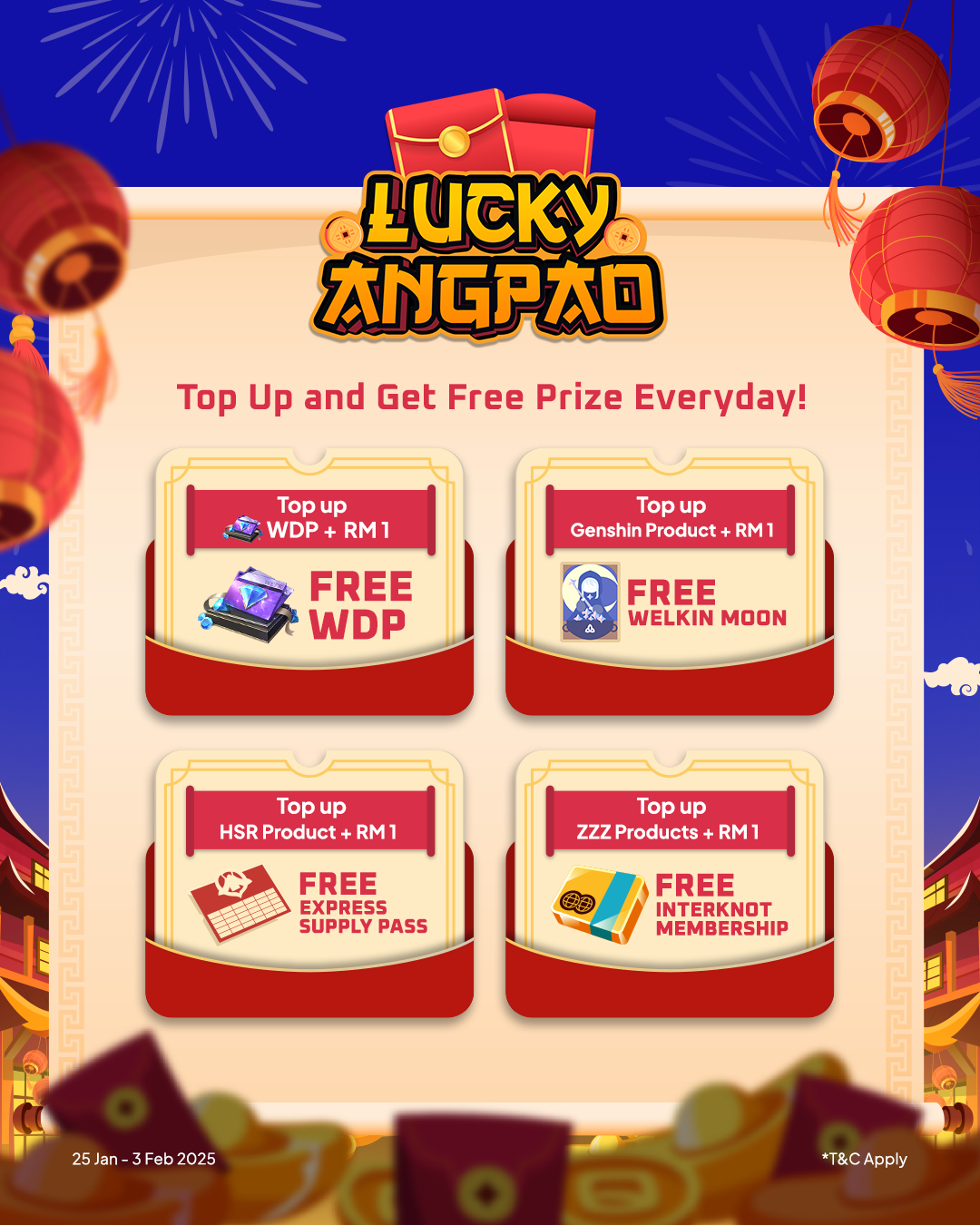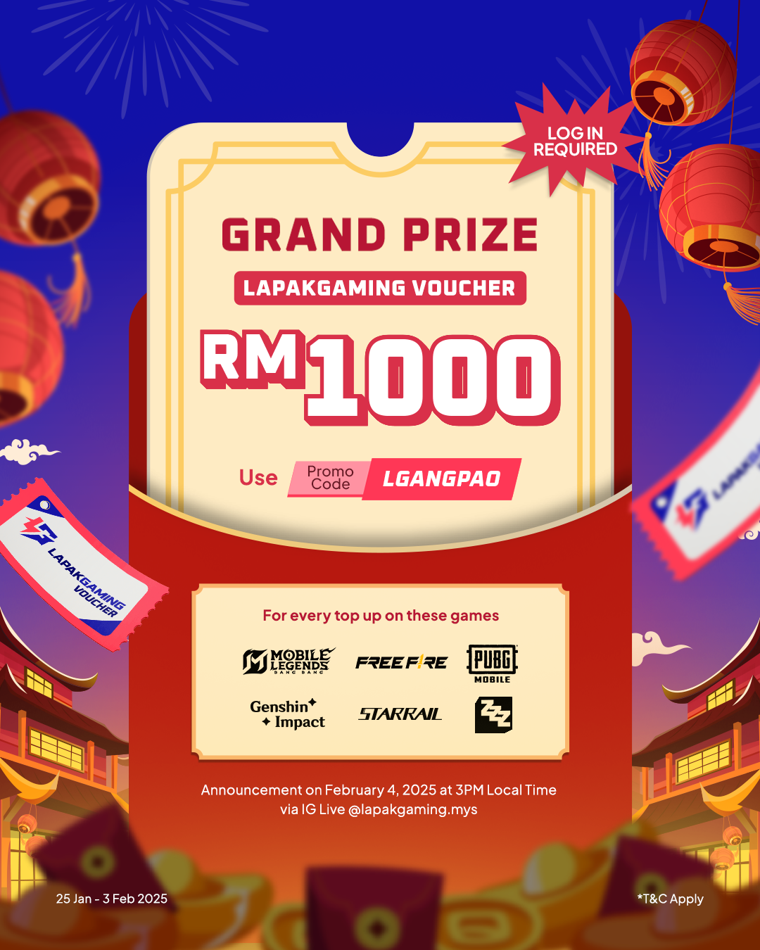 You have a chance to win the Grand Prize of a Lapakgaming Voucher worth RM1000 (for 1 Lucky Winner) by logging into Lapakgaming and entering the promo code LGANGPAO with every top-up of game products registered in the program (Mobile Legends, Free Fire, PUBG Mobile, Genshin Impact, Honkai Star Rail, Zenless Zone Zero). The more you top up, the higher your chances of winning!