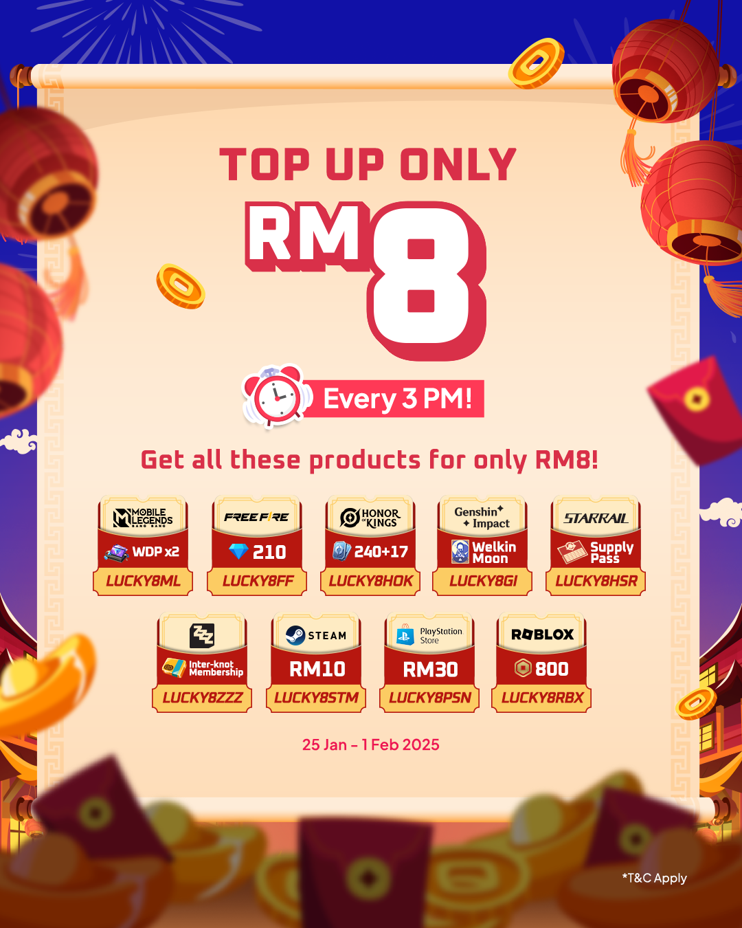 You can top up exclusive products for each game registered in the Lucky Angpao program, and don't forget to login to Lapakgaming before checkout for prize delivery. Winners will be randomly selected daily and prizes will be sent via email within one business day (H+1) during the program period.