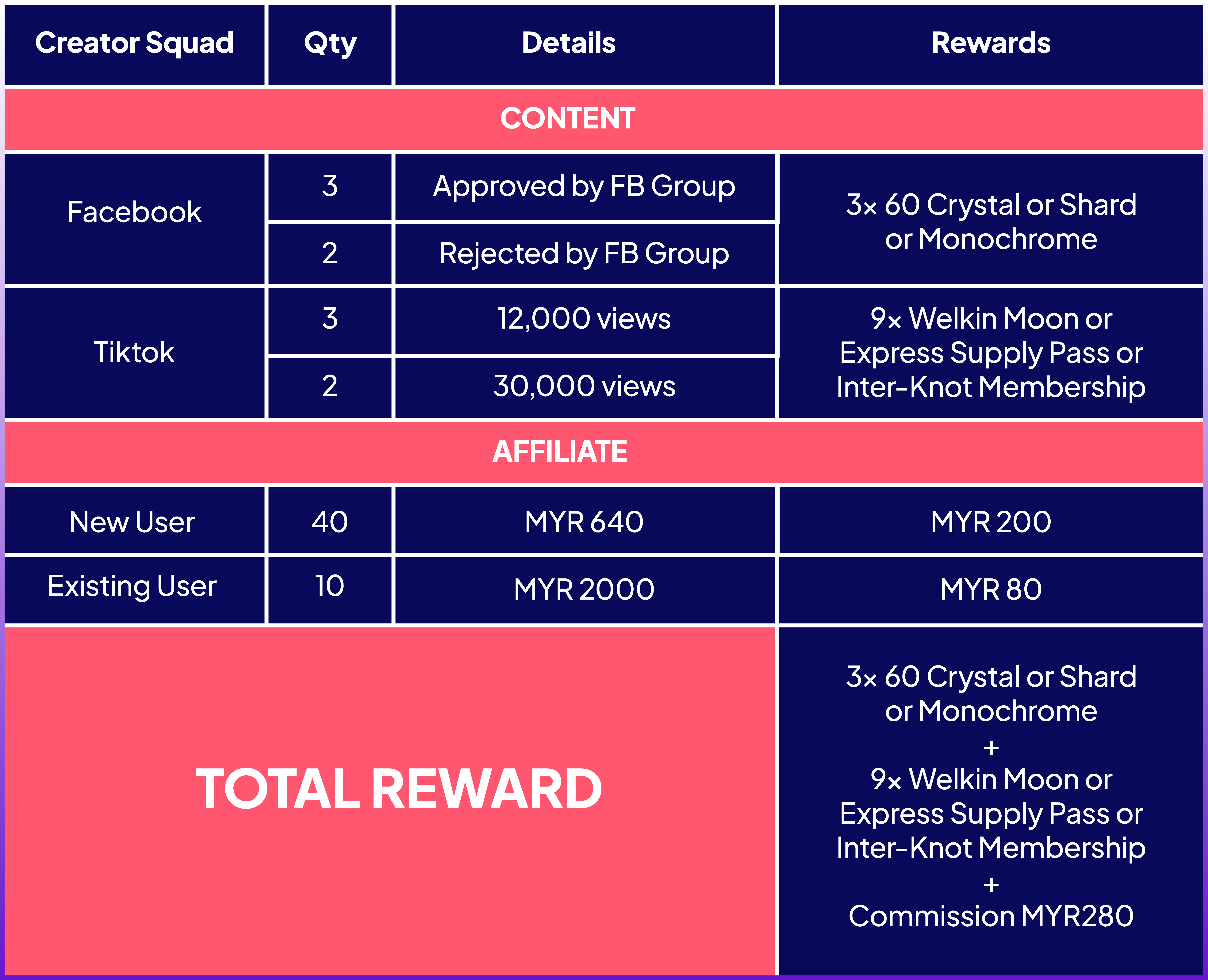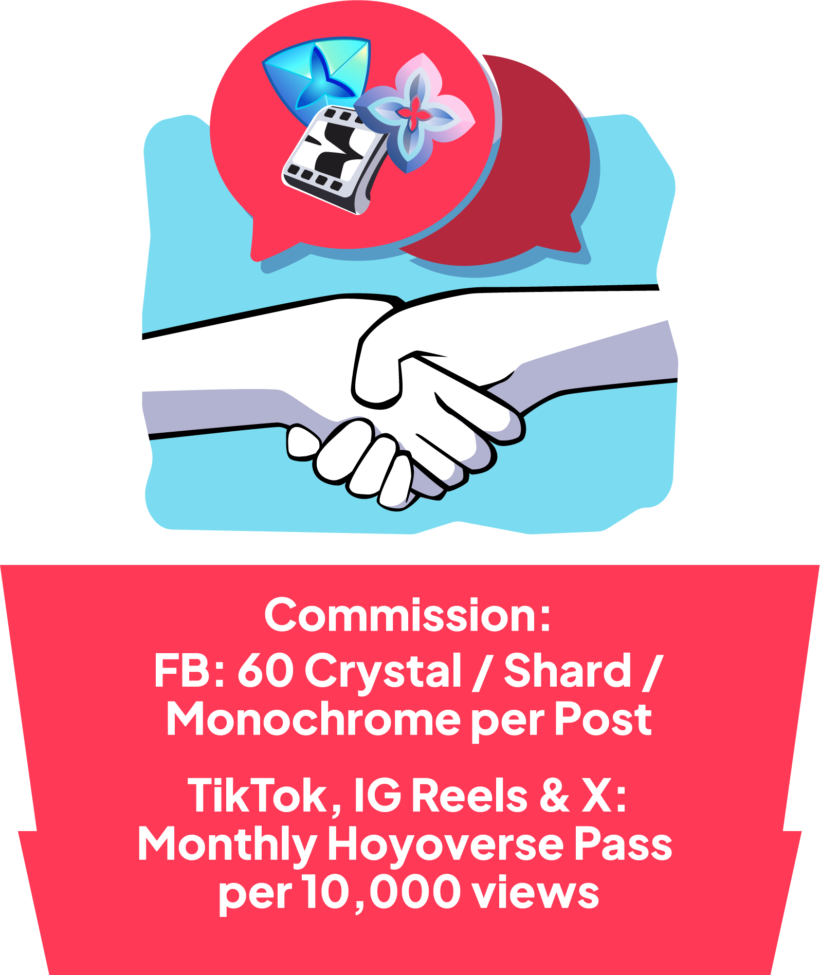 • TikTok, IG Reels & X: 5 rewards/day (Reward: Blessing of The Welkin Moon, Express Supply Pass, or Inter-Knot Membership per 10,000 views)