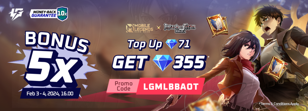 Term and Conditions : – Top up 71 diamond get 355 diamond!! – Use promo code “LGMLBBAOT“ – Promo period: 1st February 1. 16.00 2. 17.00 3. 18.00 4. 19.00
