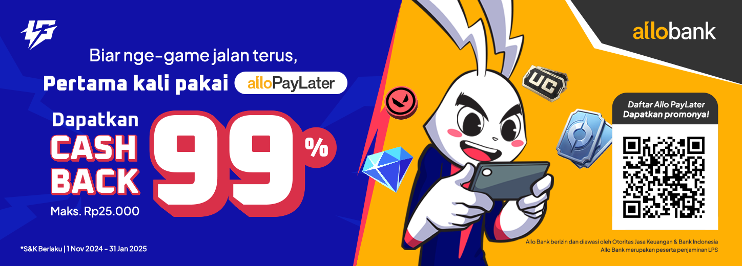 - Cashback 99% hingga Rp 25.000 untuk nasabah Allo Bank yang menggunakan Allo PayLater pertama kali (New User Allo PayLater).