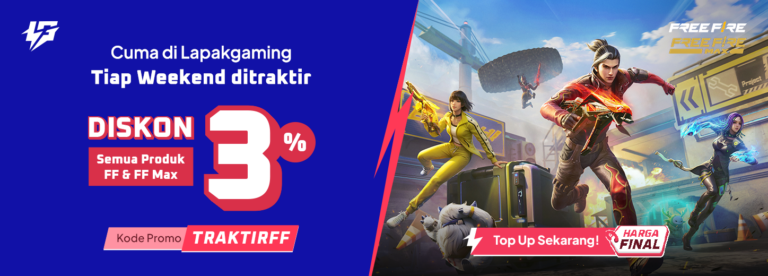 Kabar gembira untuk para survivor Free Fire! Sekarang kamu bisa menikmati diskon 3% setiap hari untuk semua denom Free Fire dengan menggunakan promo code “TRAKTIRFF”. Promo ini berlaku langsung saat kamu klik produk pilihanmu, tanpa ribet dan tanpa syarat tambahan!