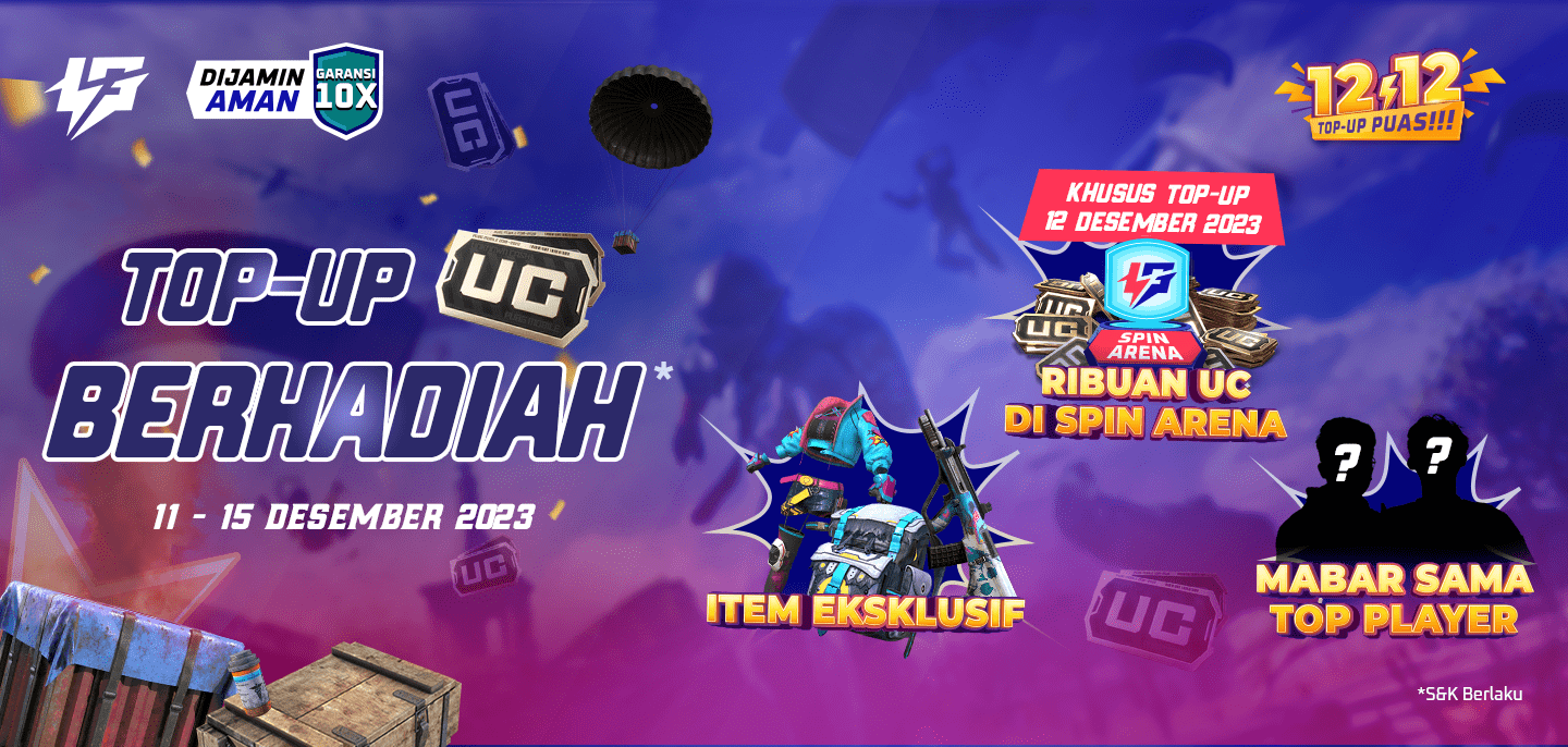 Khusus di tanggal 12 Desember 2023 setiap top up UC PUBGM di Lapakgaming selama waktu spesial ini berkesempatan mendapatkan hadiah seru berupa 1380 UC di Lapakgaming Spin Arena. Catat tanggal dan jamnya, dan jangan lewatkan kesempatan buat menangin hadiah seru!