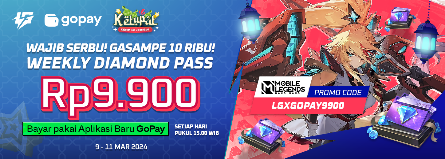 Tanggal 9 – 11 Maret ini bakal ada recharge aspirants nih, kalau kalian mau nyelesain misi topup buat dapetin skin Lesley dan Chang’e langsung top up di Lapakgaming karena lagi ada promo Weekly Diamond Pass jadi cuma Rp9,900 dengan metode pembayaran Gopay App! Kalian juga bisa dapetin tambahan cashback 70% up to 10 ribu Gopay Coins di Gopay App.