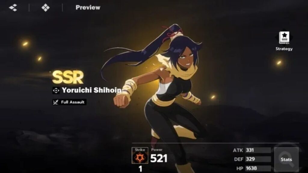 Yoruichi dikenal dengan serangan cepat dan combo agresif. Ia sangat efektif untuk melawan Elite Boss karena fokus pada single target damage. Ultimate-nya bisa memberikan hingga 500% damage di serangan pertama. Sebagai karakter SSR, Yoruichi cocok dijadikan DPS utama.