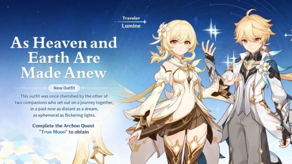Setelah kamu menyelesaikan Archon Quest “True Moon”, kamu akan langsung mendapatkan outfit baru untuk Traveler dengan nama As Heaven and Earth Are Made Anew secara gratis. Desainnya terlihat lebih megah dan sangat cocok dengan tema besar update Luna IV.