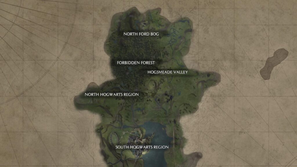 - World Map: Map terbesar yang mencakup wilayah luar Hogwarts dan Hogsmeade, seperti hutan, desa kecil, dan area eksplorasi lainnya. Map ini dipakai untuk perjalanan jarak jauh dan petualangan di luar sekolah.