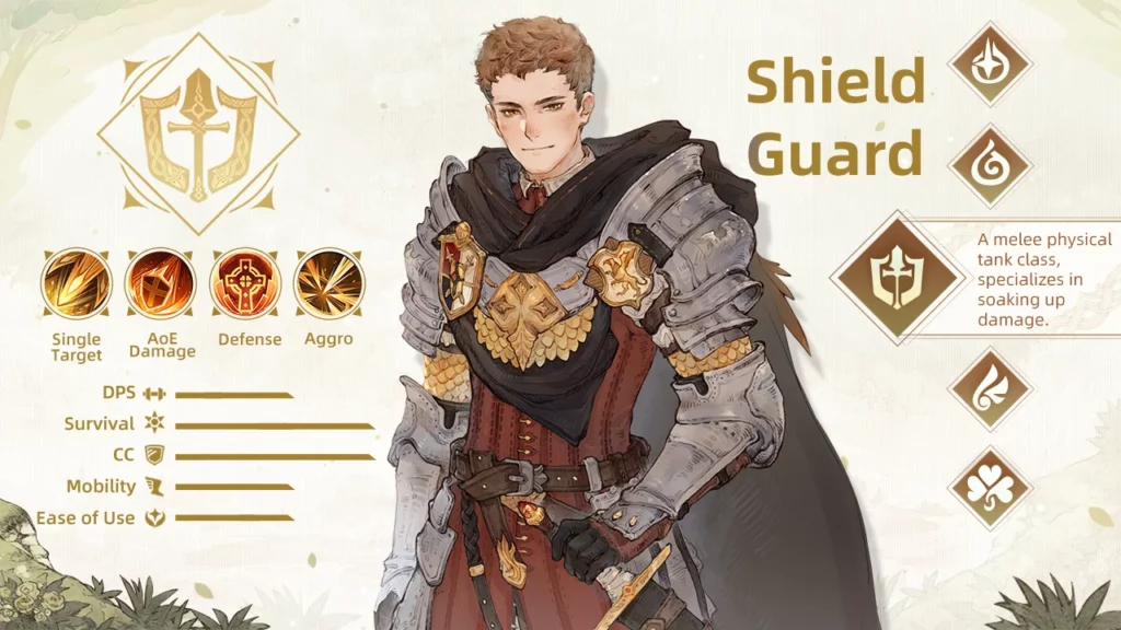 - Shield Guard: Tanker dengan output Melee Physical DMG bertugas untuk memberi AoE dan menciptakan Shield bagi rekan tim.