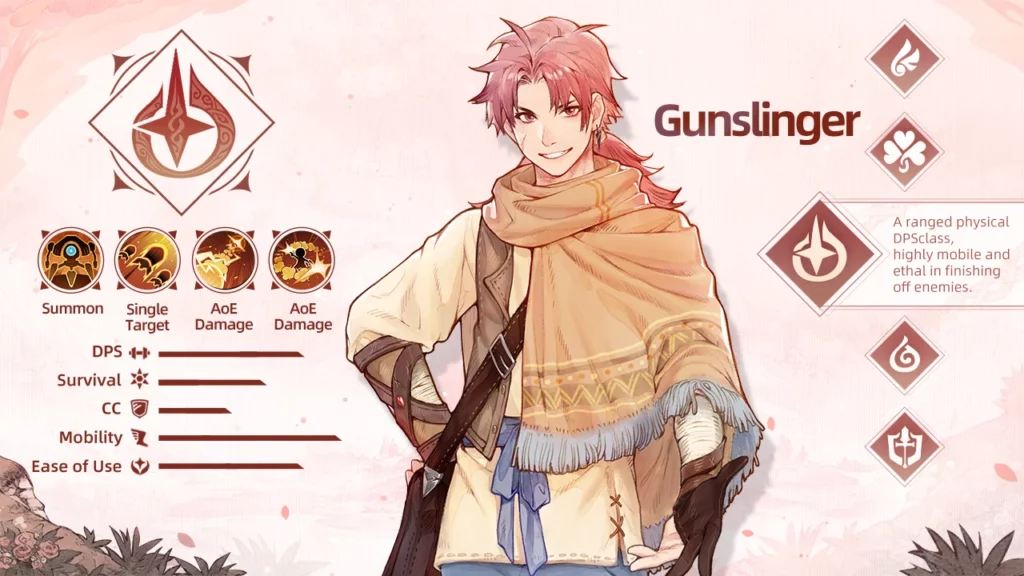 - Gunslinger: Kelas Physical DMG yang bisa menyerang musuh dari jarak jauh dengan senjata dan robot buatannya. Memiliki mobilitas tinggi dan bisa beradaptasi di segala situasi.