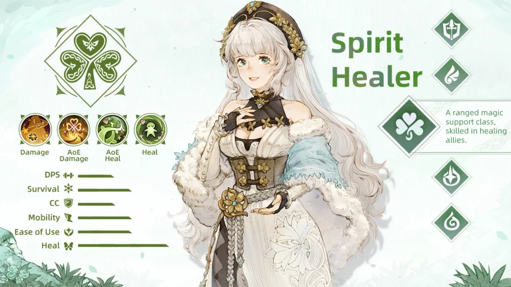 - Spirit Healer: Healer sebagai Support tim dalam pertarungan yang juga bisa memberi AoE DMG lewat tanaman yang dikuasainya.