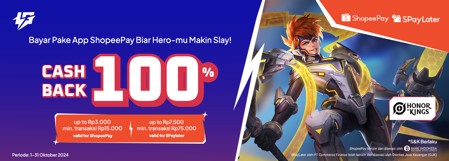 Lapakgaming kembali menghadirkan promo spesial buat kamu untuk top-up game dengan ShopeePay atau SPayLater! Selama periode 1-31 Oktober 2024, nikmati cashback hingga 100%! Promo ini berlaku untuk pengguna baru ShopeePay dan SPayLater.